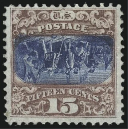 1868 1¢ Z Grill: Talk about rare - only two of these 1868 1 cent Z Grill stamps exist today! They were made with a special grill pattern to stop people from reusing the stamps.